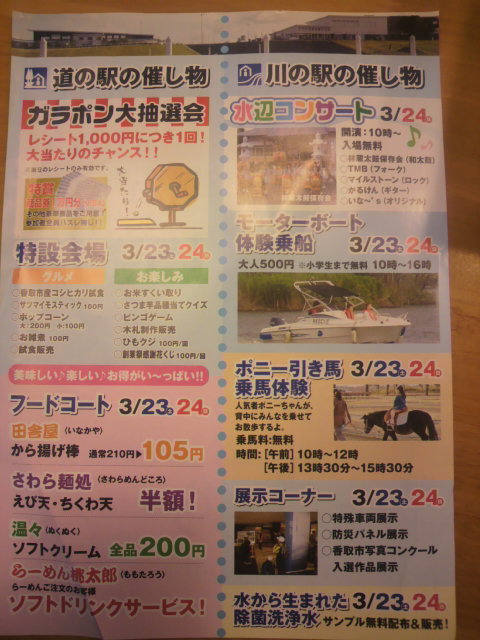 「川の駅」の「催し物」ですが、「水辺コンサート」(3月24日のみ)、「モーターボート体験乗船」、「ポニー引き馬乗馬体験」、「展示コーナー」、「水から生まれた除菌洗浄水」となっています。